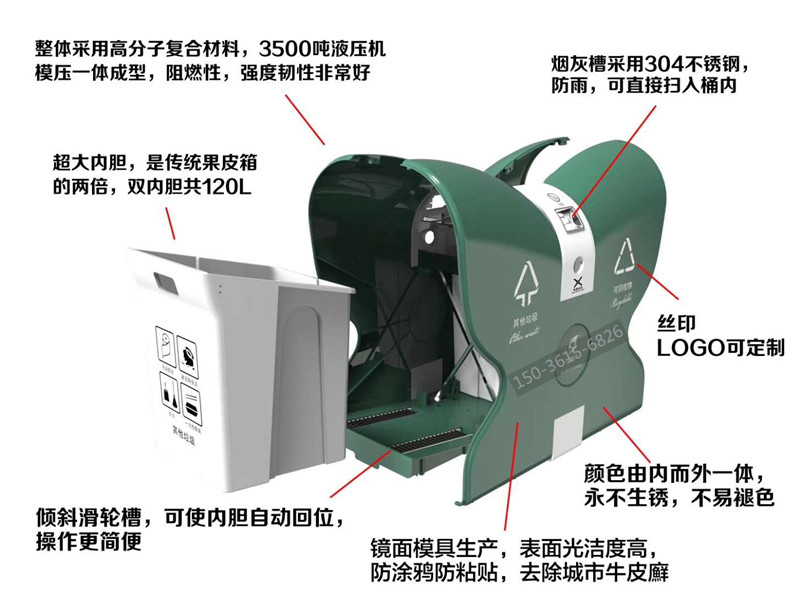 產(chǎn)品特點(diǎn): 鏡面模具生產(chǎn),表面光潔度高,防涂鴉防粘貼,防砸,耐燒,永不生銹,不易褪色,耐酸堿,易清洗,使用壽命長(cháng),具有天然的防盜功能;操作簡(jiǎn)單,深受環(huán)衛系統客戶(hù)青睞。